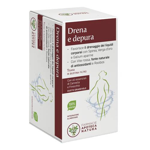 Drena e depuraDescrizione Integratore alimentare. Tisana caratterizzata dalla presenza di spirea e verga d’oro che favoriscono il drenaggio dei liquidi corporei in sinergia con il Galium aparine che agisce anche sulle funzioni depurative dell’organismo. Inoltre il prodotto contiene rooibos e vite Rossa, fonte naturale di antiossidanti. Per rendere più completa la depurazione è utile favorire un’azione antiossidante contrastando i radicali liberi che si possono accumulare a livello cellulare. Completano la formulazione gli oli essenziali di finocchio e cannella che conferiscono alla tisana un sapore gradevole anche senza l’aggiunt...